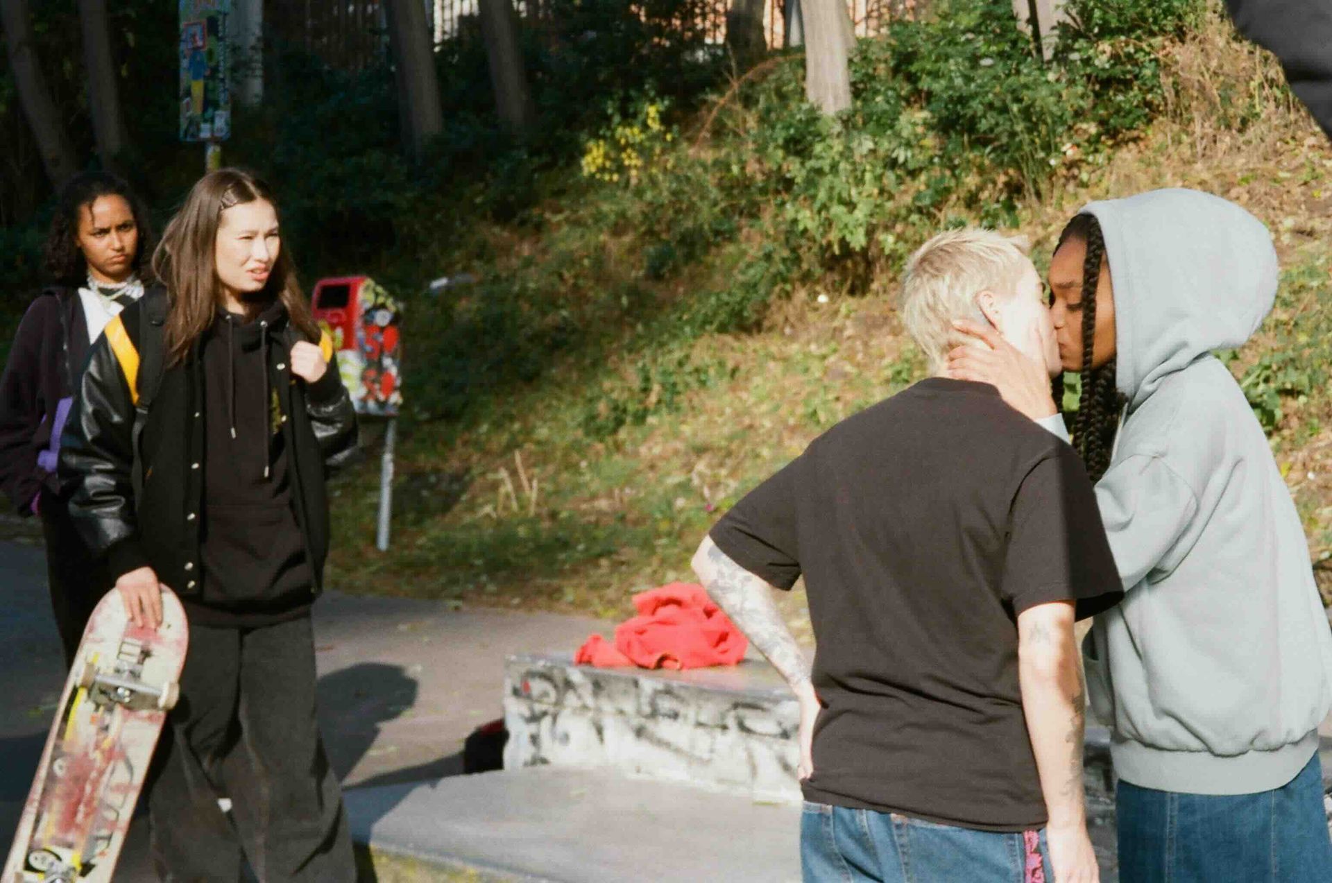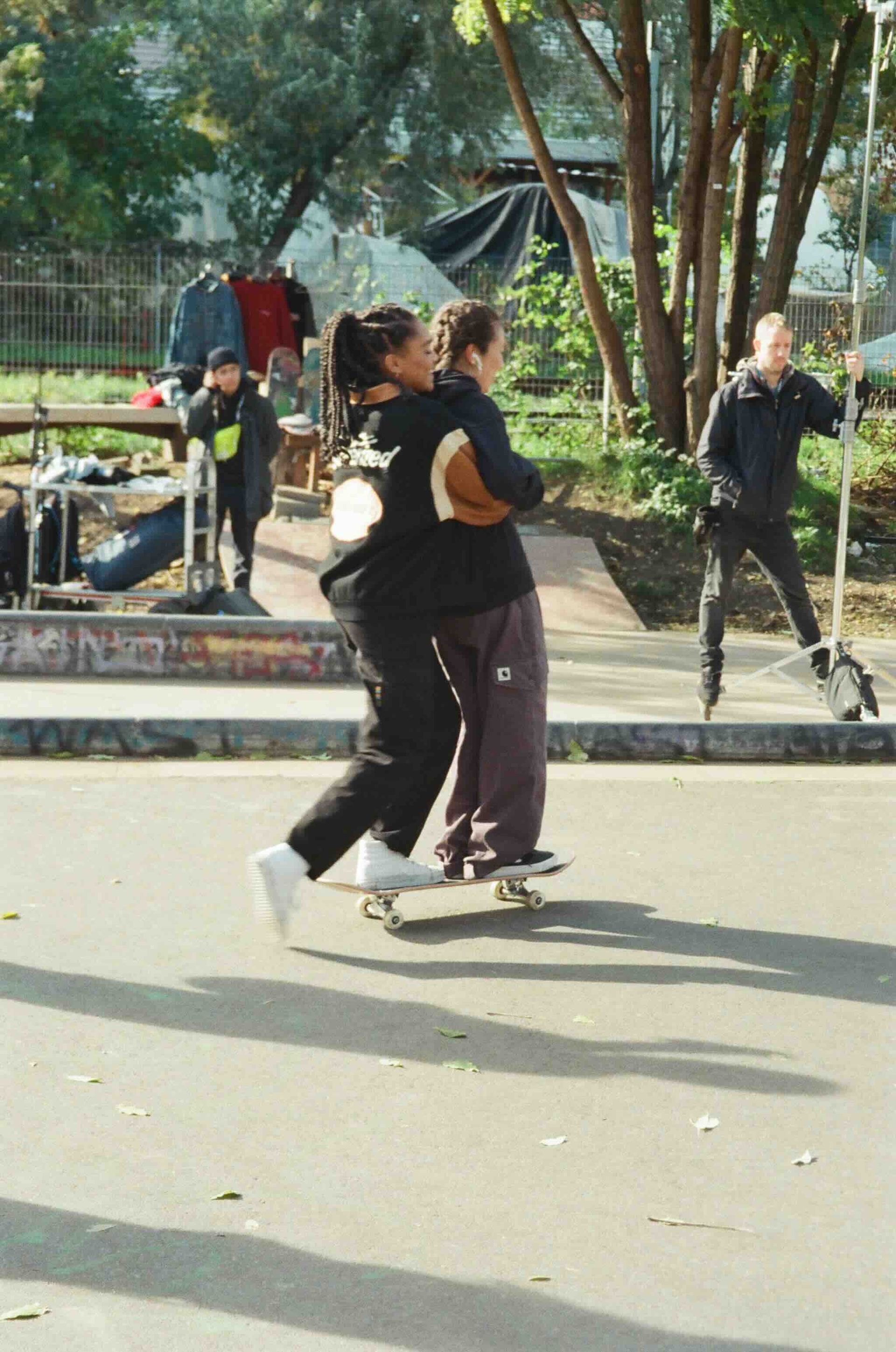Der Film ist mit Laien und Schauspieler*innen besetzt. Unsere Skater*innen im Film haben wir vor allem durch die bereits existierende Skatecrew VUM gefunden. Kesse wird von Pascale gespielt, Fanni von Lea, Marine von Melika und Kati von Marine. Ludwig, der Isaac spielt, und Lasse, der Pepe verkörpert, haben wir durch Community Castings in Berlin kennengelernt. Sie alle sind leidenschaftliche Skater*innen und nehmen an Wettbewerben in ganz Europa und den USA teil. Insbesondere die VUM Crew eint unterschiedliche Backgrounds; sie stammen aus den USA, den Niederlanden, Afghanistan und Frankreich und identifizieren sich als queer femme Skatecrew. Ihr Ziel ist es, gemeinsam eine gute Zeit zu haben, Videos zu drehen, neue Tricks zu lernen und vor allem für Sichtbarkeit und Akzeptanz zu kämpfen, denn die Skaterszene ist bis heute eher männlich dominiert. Die persönlichen Geschichten, die sie mitbringen, finden insbesondere durch die Einbindung von selbst gedrehtem Skatevideomaterial Einzug in unserem Film.